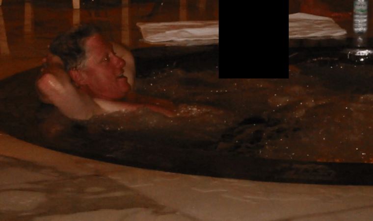 Not fair. Clinton is in a hot tub and wearing trunks. Even if the redacted person is a precocious teenager, he isn’t doing anything. If this is as incriminating as his photos get, then he was remarkably restrained.