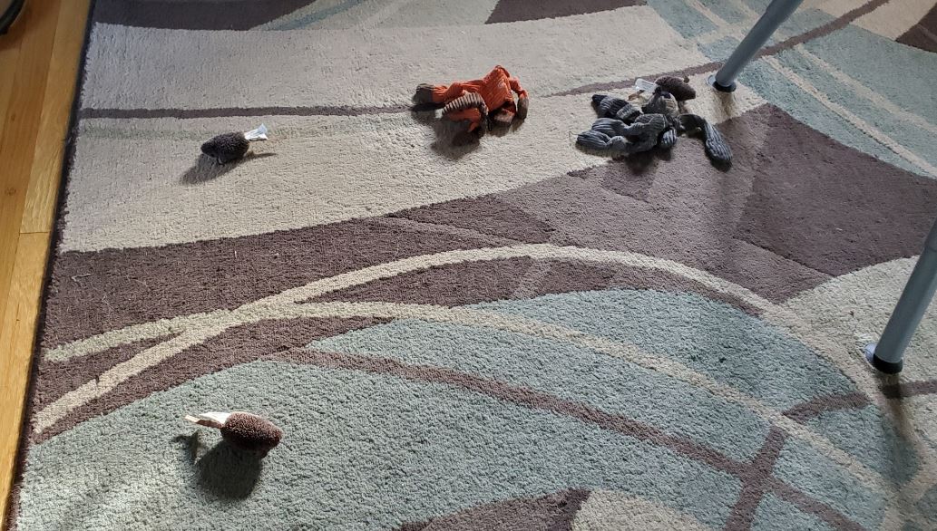 When I got up this morning, this was in the dining room.  Nothing has been touched except the green ball at the bottom of the photo.  I bumped it with my foot.