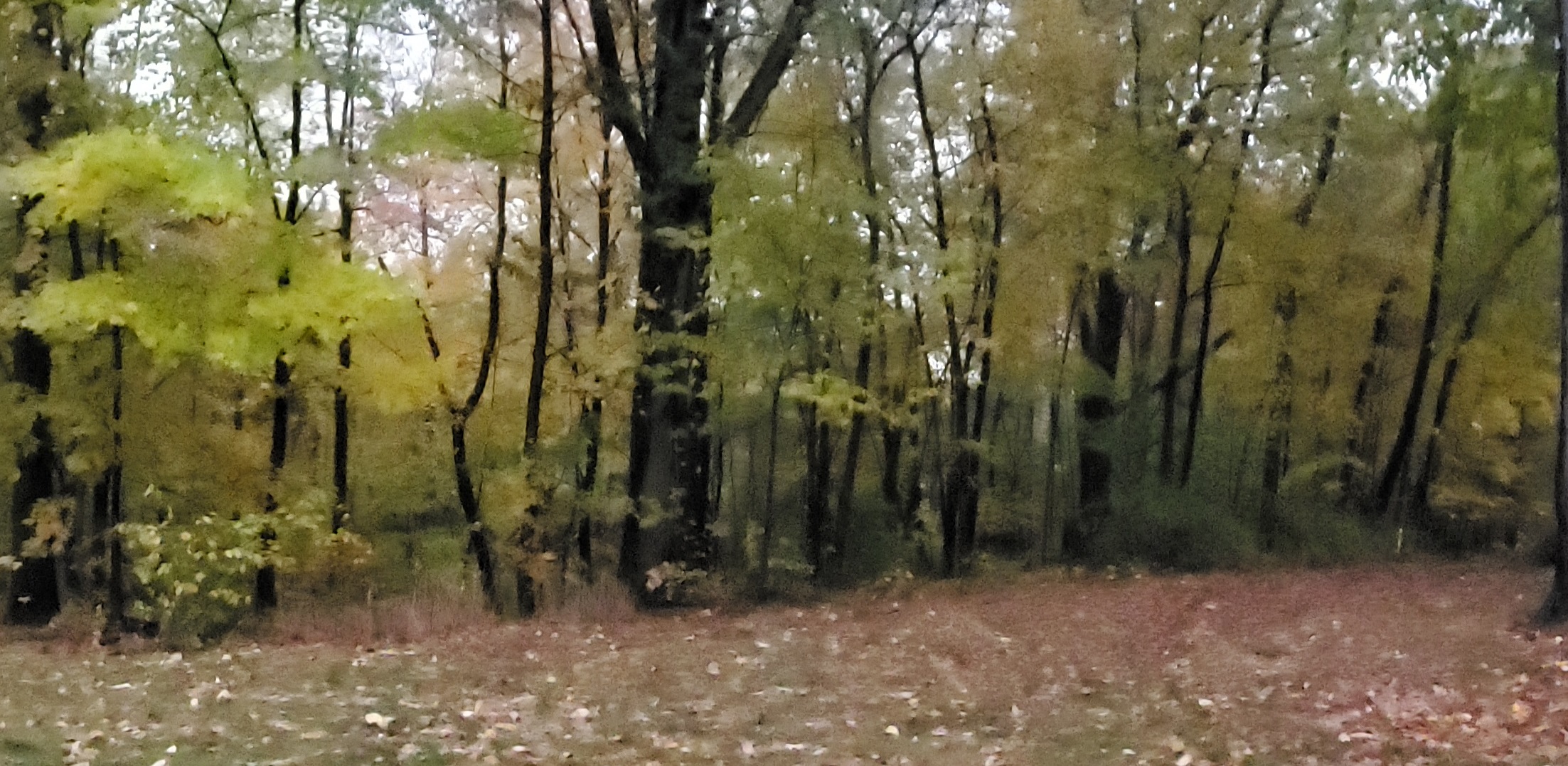When I took Sparky out this morning, it was cold and drizzly, but the trees are having a good Autumn. The photo unintentionally came out blurry and impressionistic. I like it.