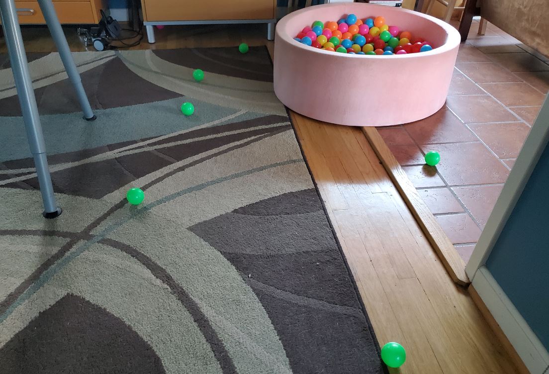 When I got up this morning, this was in the dining room. Nothing has been touched except the green ball at the bottom of the photo. I bumped it with my foot.
