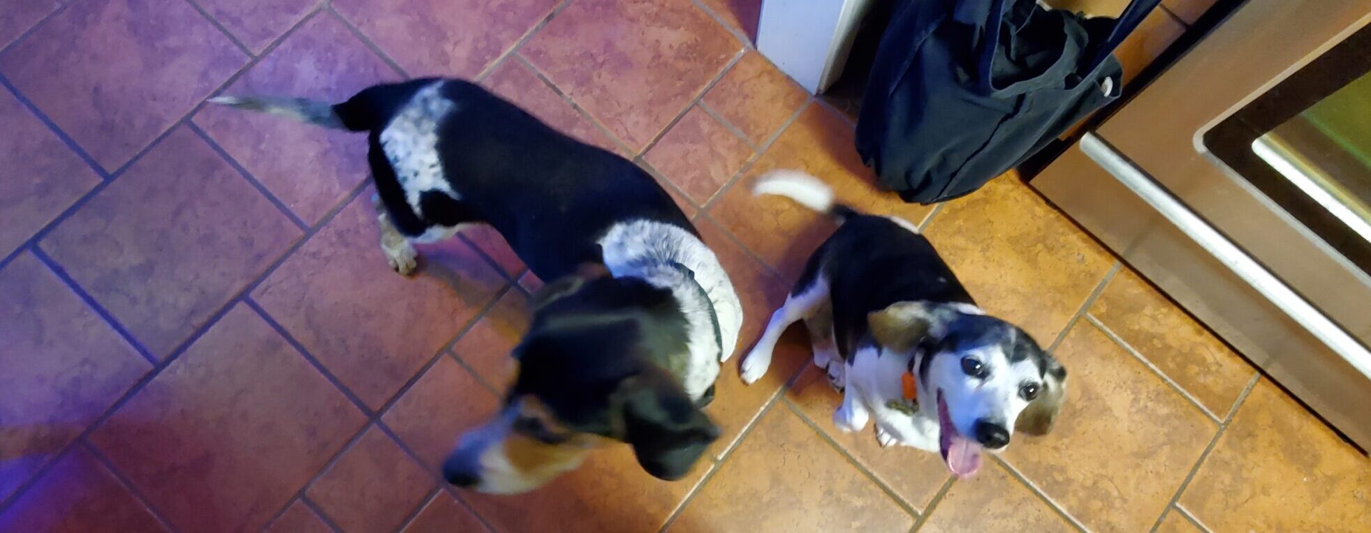 Watch the tails and the feet. Rusty comes in with a big idea. His tail is wagging like mad, but his shifty feet show that he isn’t sure how the boss is going to like it.