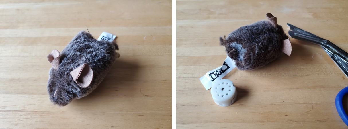 I cut the tweeter out of a new mouse, and stuffed it into this snack ball.