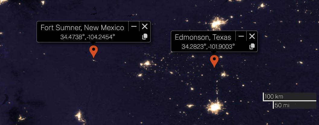 Texas is really big, about the same size as France. Compared to France, it’s pretty empty. Especially the part near New Mexico. Clovis, Texas is the bright spot between the launch site at Fort Sumner, and the landing site in Edmonson.