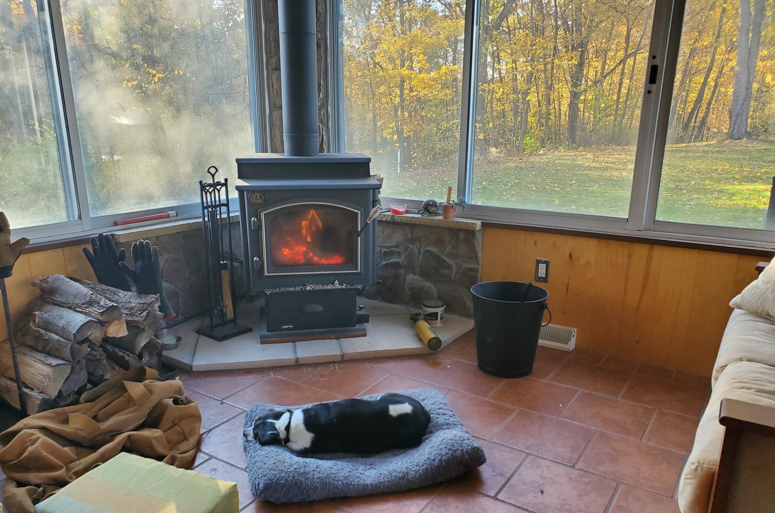 When I finished my shave and shower, I found that Sparky had gotten up and out. He starts the day by taking a nap by the fire, and I start the day seeing him taking a nap by the fire. Everybody wins.