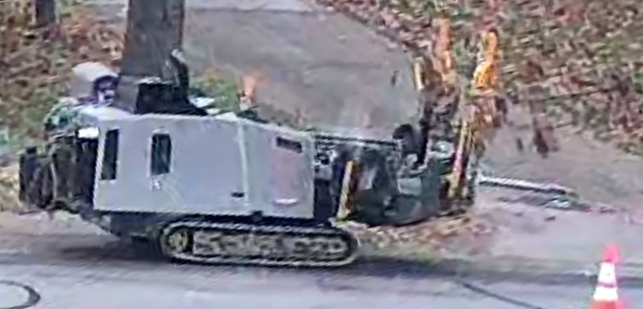 Here’s the boring machine. Those yellow hydraulic cylinders on the right extend to tip the left side toward the ground. Drill sections are added to extend the reach as it bores.