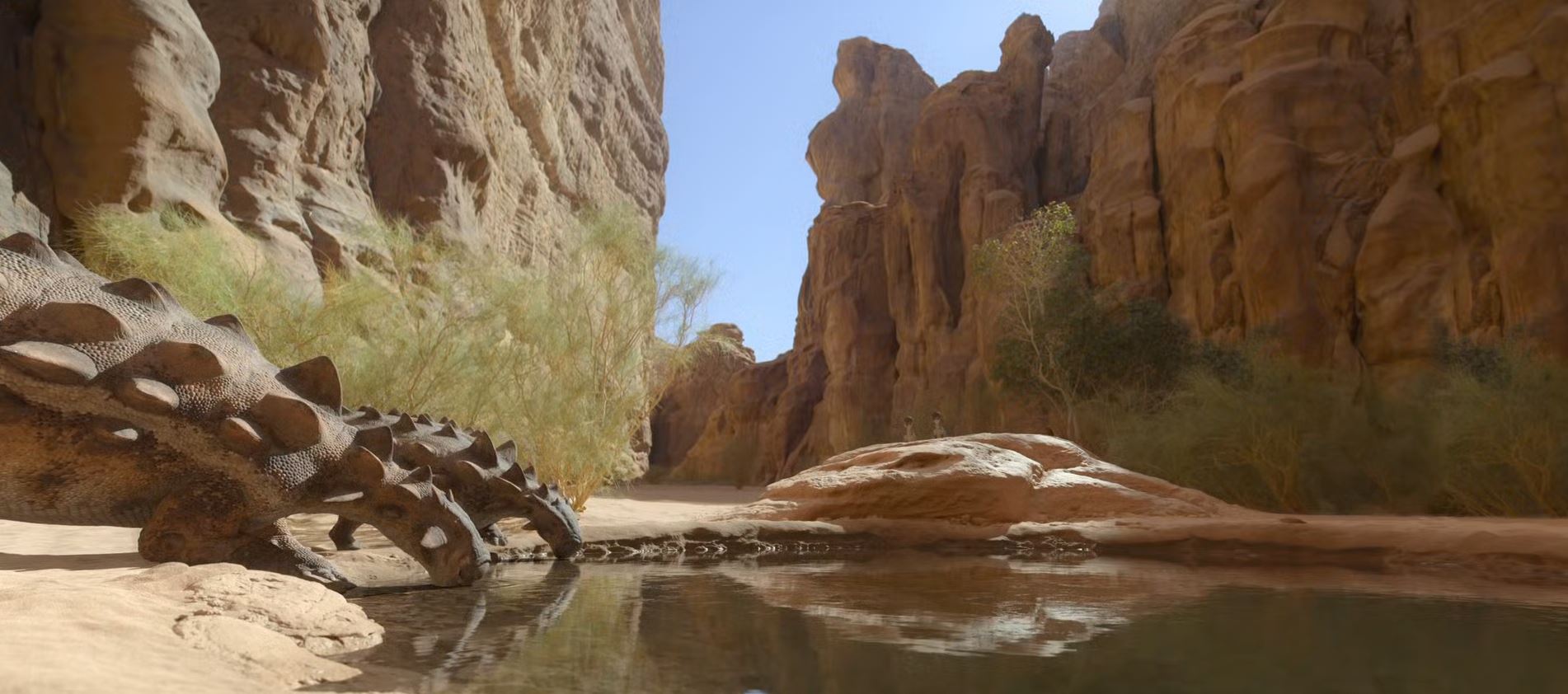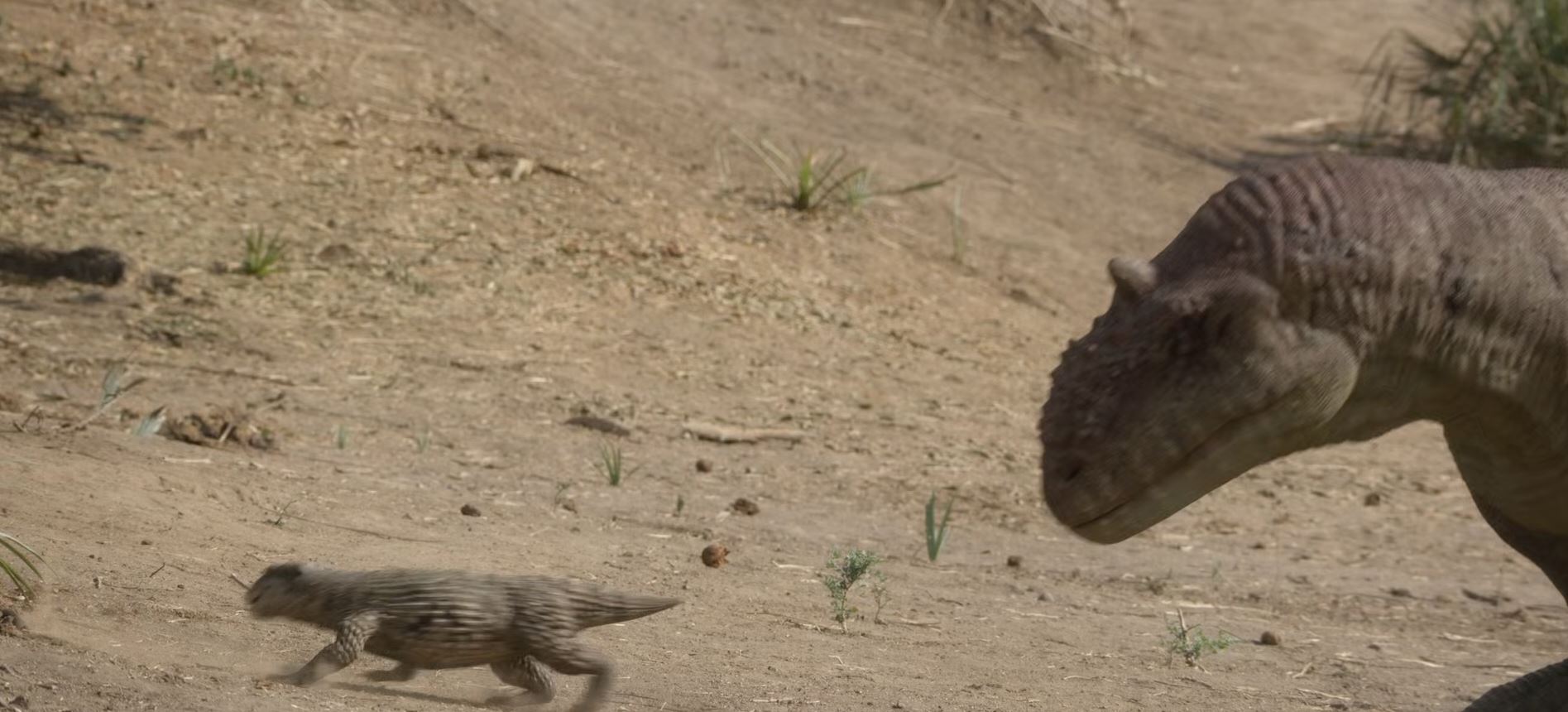 It’s a little patronizing that cute dinosaurs that the show follows, don’t get eaten. That’s probably to avoid scaring the children. For instance, this Majungasaurus comes upon a Simosuchus. The little crocodile ancestor does some aggressive tail wagging and butt shaking, and the Majungasaurus is convinced to leave.