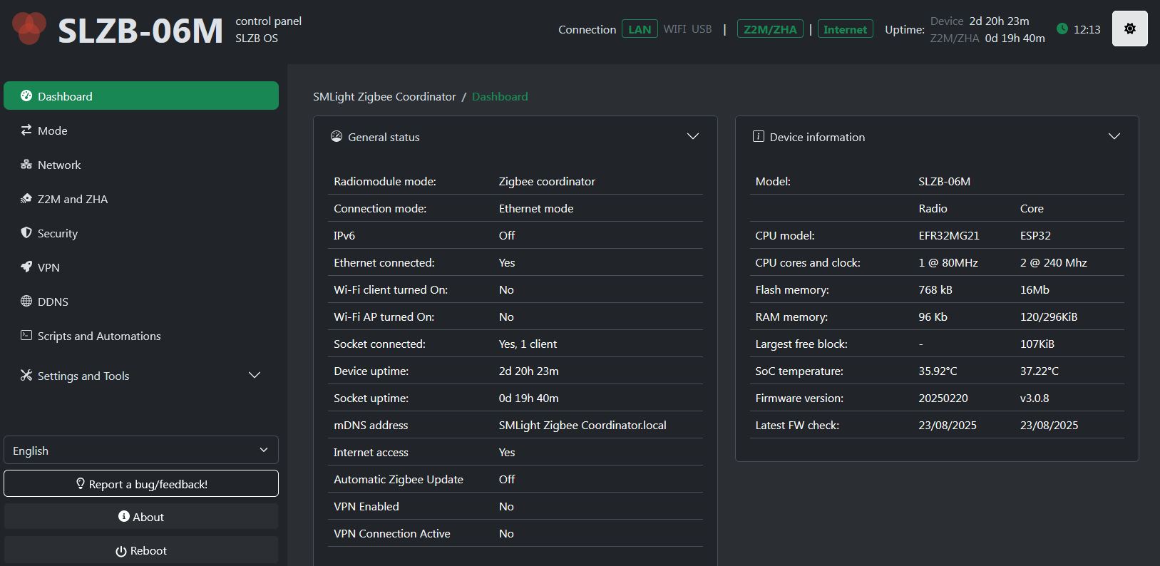 The Philips HUE hub was up and running. The Zigbee hub was up, but not talking to it’s devices. Zigbee has a dashboard similar to the router page, but I don’t know what any of this means. Since nothing was working, it’s probably one simple thing to get everybody back to work.