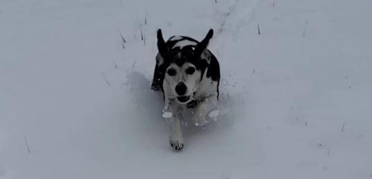 Sparky is running along on his own, but came when called, then went to patrol the bridge.