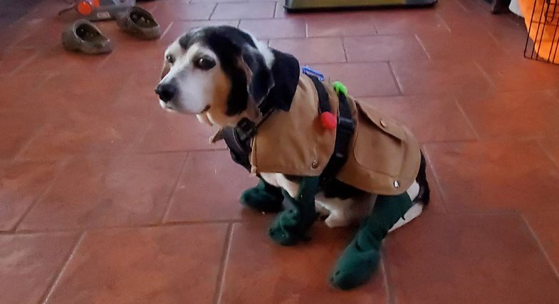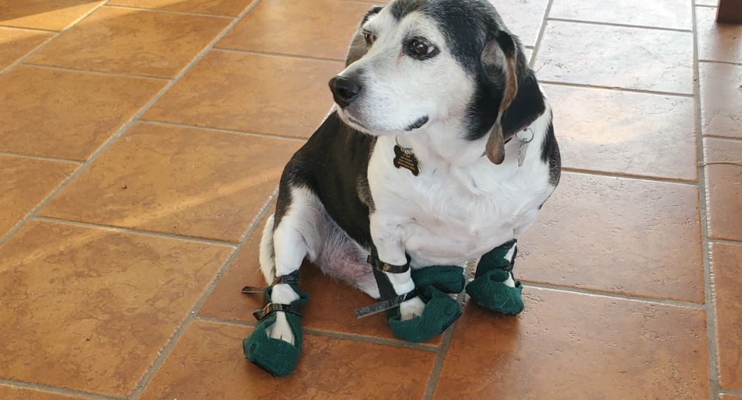 They were more like garter-boots because the top of each boot snapped into his Carhartt jacket. Getting them on was a problem because dog feet are weird, and he could usually step out of them.