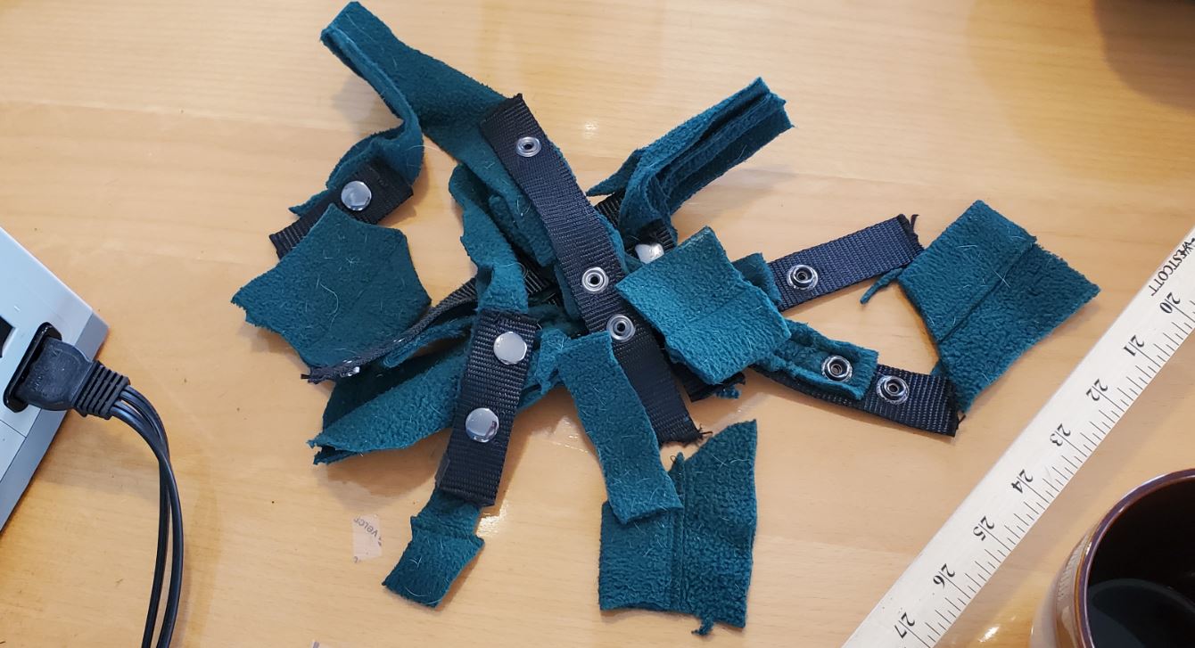 This morning, I tried snow slippers instead. I cut down his garter-boots to remove the snaps and straps, to make them lighter and less bulky. Here’s how much material was removed.