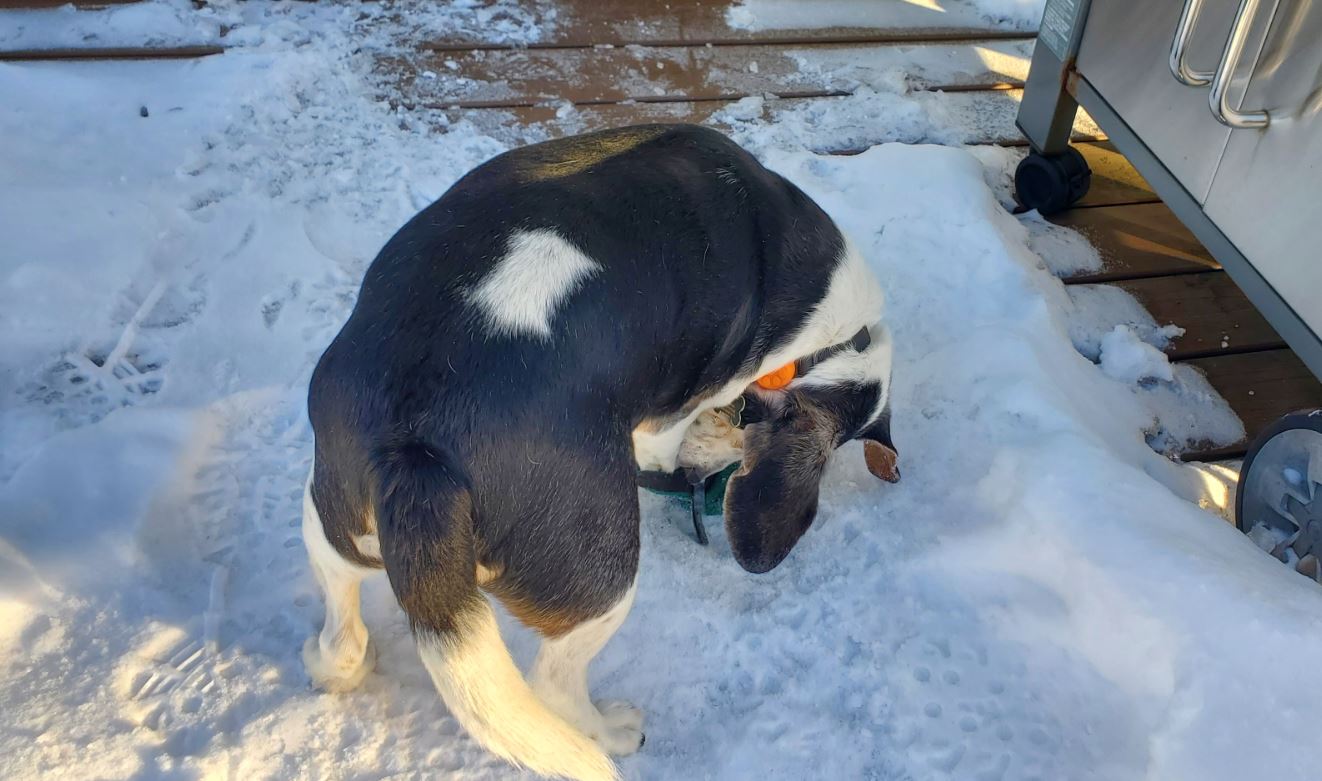 Sparky doesn’t see the problem with icy paws. When he goes to piss, if he gets an icy paw, he can hop back to the deck on three legs. Since finding the right place to poop takes more time, he can just shit in the house. What’s the problem?